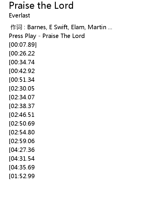 | [04:44.56][04:27.36][03:20.68][03:03.85][01:32.09] | Praise the Lord |