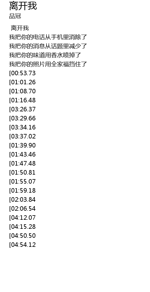 | [04:35.46][03:34.16][01:32.39] | 离开你 |