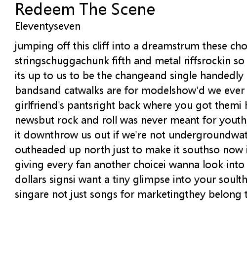 jumping off this cliff into a dreamstrum these chords so hard i'm snapping stringschuggachunk fifth and metal riffsrockin so hard we're breakin hipsbut now its up to us to be the changeand single handedly redeem the scenestages are for bandsand catwalks are for modelshow'd we ever get these two confusedput your girlfriend's pantsright back where you got themi hate to be the one to break the newsbut rock and roll was never meant for youthrow your fist up high then pull it downthrow us out if we're not undergroundwatching these bands blow up and outheaded up north just to make it southso now its up to us to be the voiceof giving every fan another choicei wanna look into your eyes and not just see the dollars signsi want a tiny glimpse into your soulthe songs that my band loves to singare not just songs for marketingthey belong to you to love and hold |