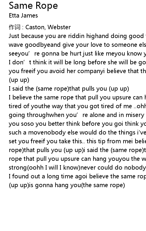 | I believe the same rope that pull you upsure can hang youone day she will get tired of youthe way that you got tired of me ..ohh yeahyou will see what i'm going throughwhen you’re alone and in misery ..ohh yeahi hate to say i told you soso you better think before you goi think you are such a fullfor making such a movenobody else would do the things i've done for youand i'm willing to set you freeif you take this.. this tip from mei believe that the (same rope)that pulls you (up up)i said the (same rope)that pulls you (up up)the same rope that pull you upsure can hang youyou the we week may same day be strong(oohh I will I know)never could do nobody wrong | |