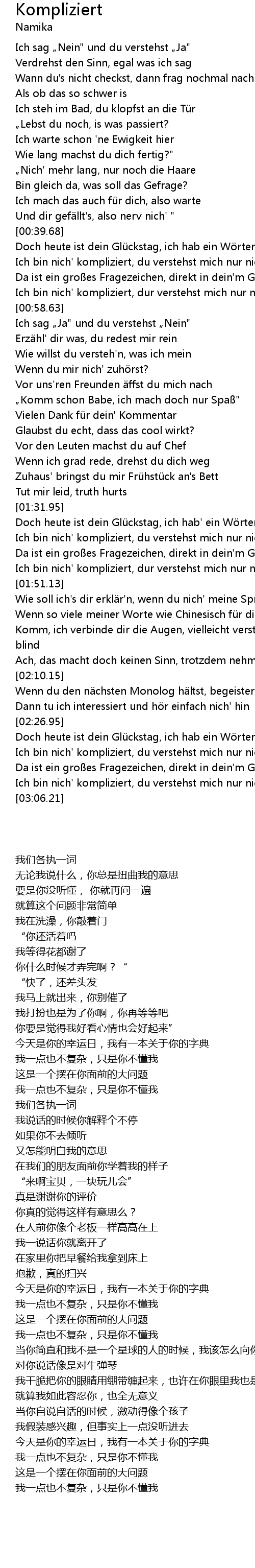 | [01:46.70] | Ich bin nich' kompliziert, dur verstehst mich nur nich' |
