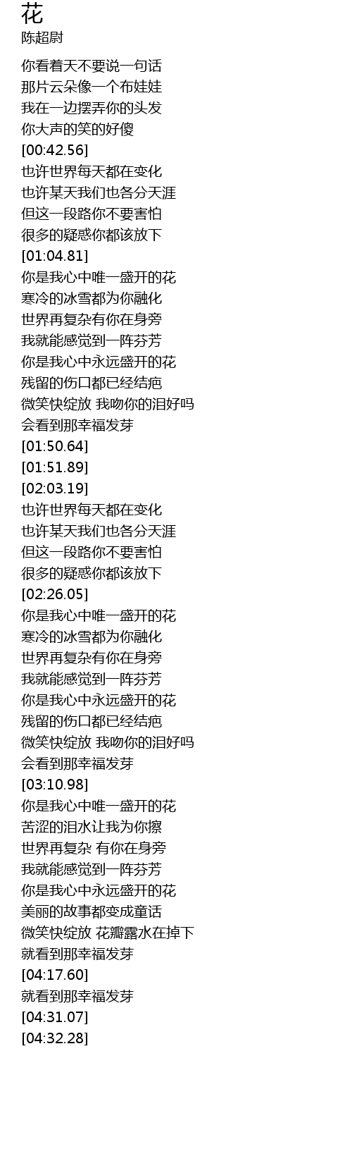 | [03:34.91] | nǐ shì wǒ xīn zhōng wéi yī shèng kāi de huā |