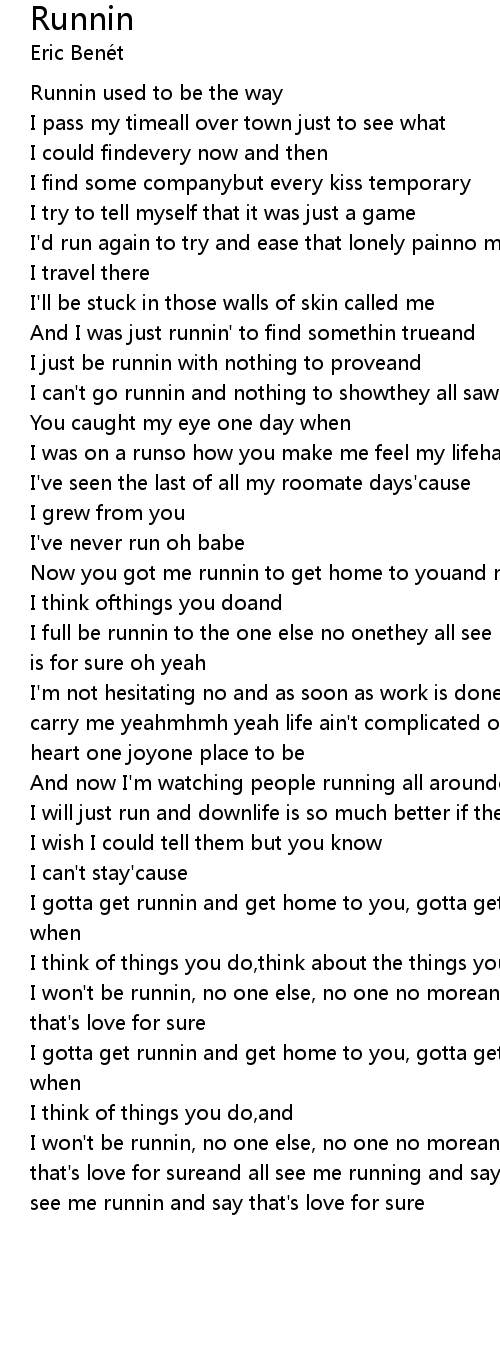 I won't be runnin, no one else, no one no moreand now see me runnin and say that's love for sureand all see me running and say that's love for surethey all see me runnin and say that's love for sure |