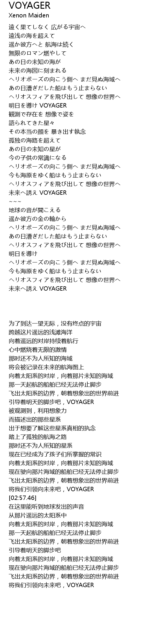 | [02:51.77] | 将我们引领向未来吧,VOYAGER |