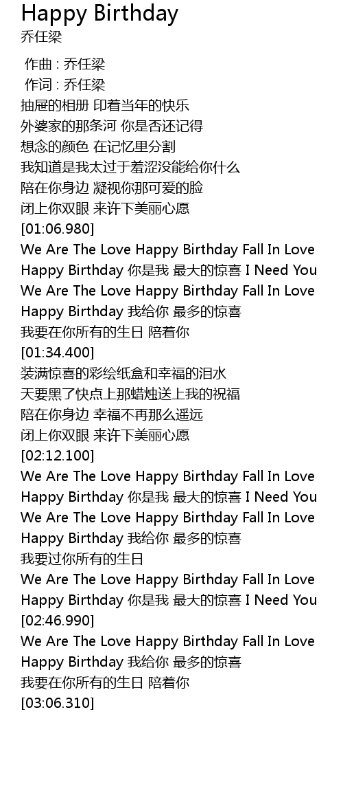 | [01:13.250] | Happy Birthday nǐ shì wǒ zuì dà de jīng xǐ I Need You |