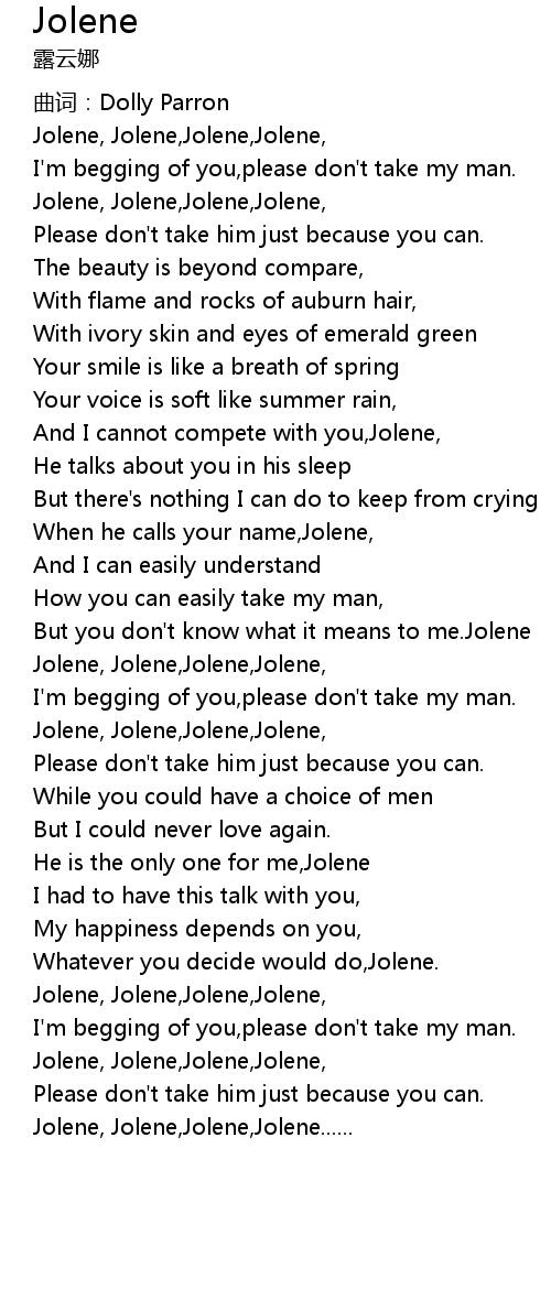 | [01:20.17] | Jolene, Jolene,Jolene,Jolene, |