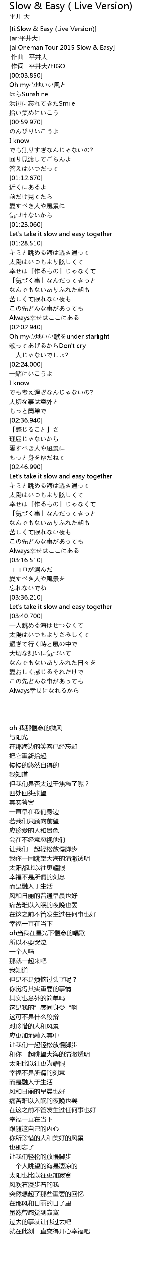 | [00:01.00] | 作词 : 平井大/EIGO |