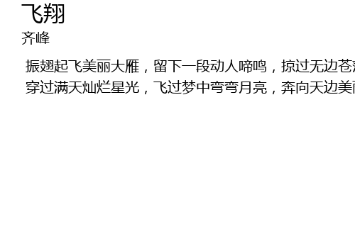 | zhèn chì qǐ fēi měi lì dà yàn, liú xià yī duàn dòng rén tí míng, lüè guò wú biān cāng máng dà dì, fēi xiàng yáo yuǎn wèi lán tiān biān. dà yàn zhǎn chì pái chéng yī xíng, fǎng fú yī shù yín sè líng guāng, dài zhe xīn zhōng cháng zhǎng sī niàn, huà kāi yī dào ài de háng xiàng. xīn shàng rén wéi wǒ gē chàng, yòng nǐ nà gē shēng hū huàn nà fēi xiáng de dà yàn, dài zhe wǒ sī niàn fēi luò nǐ shēn páng. | |