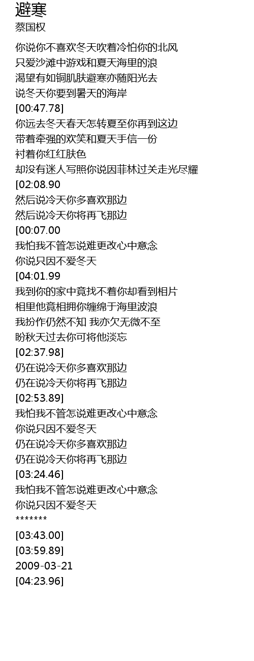 | [00:41.90] | shuo dong tian ni yao dao shu tian de hai an |