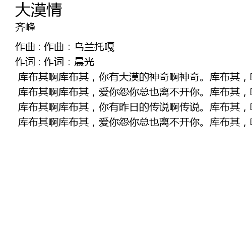 | kù bù qí a kù bù qí, nǐ yǒu dà mò de shén qí a shén qí. kù bù qí, a kù bù qí, nǐ yǒu dà mò de měi lì měi lì. qī xīng hú shuǐ zài wǒ xīn zhōng dàng yàng, dà mò chūn guāng zài wǒ mèng zhōng chuán chàng. | |