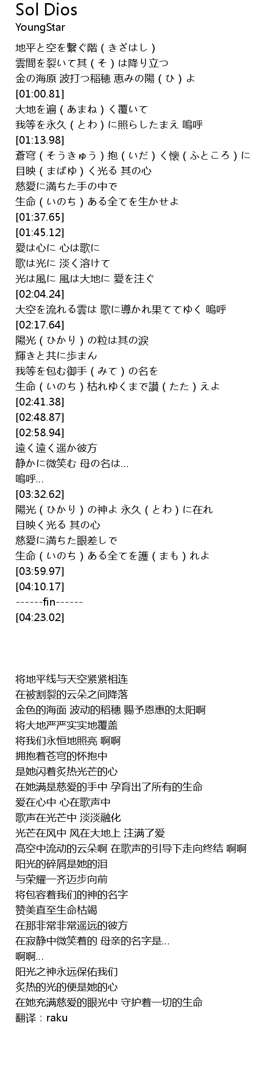 | [03:33.86] | 陽光(ひかり)の神よ 永久(とわ)に在れ |