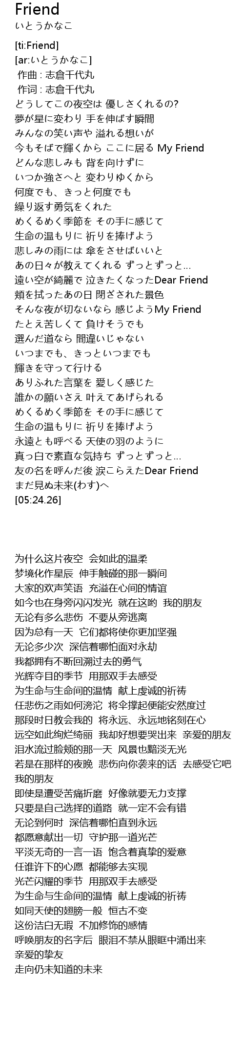 | [05:06.36] | 呼唤朋友的名字后 眼泪不禁从眼眶中涌出来 亲爱的挚友 |