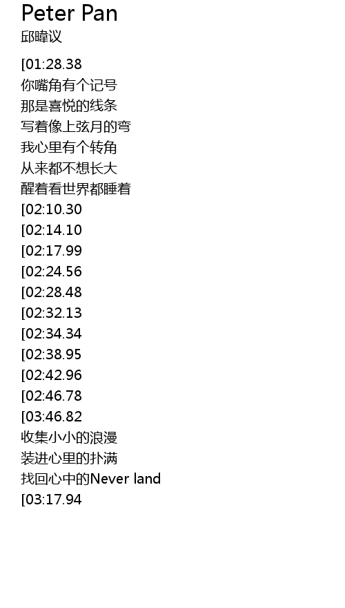 | [00:11.00][01:28.38][03:53.94] | 邱�议-Peter Pan |