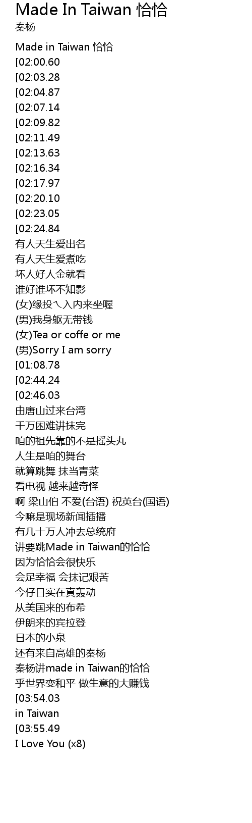 | [03:57.46][03:54.03][03:50.71][03:47.48][03:44.16][03:40.91][03:37.59][03:34.37] | Made in Taiwan |