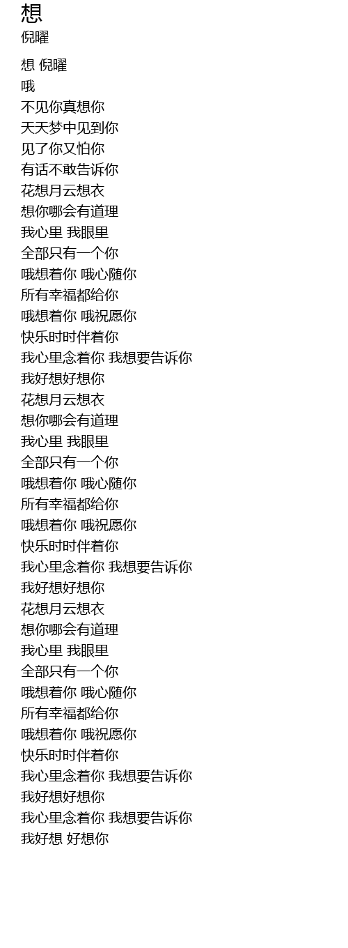 | [01:21.42] | wǒ hǎo xiǎng hǎo xiǎng nǐ |