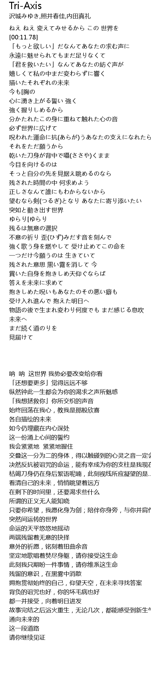 | [01:36.24] | 呪われた運命に抗(あらが)うあなたの支えになれたら それをただ願うから |