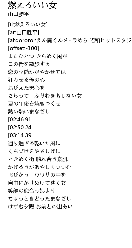 | [01:21.11][02:46.91][03:05.31] | 燃えろいい女 |