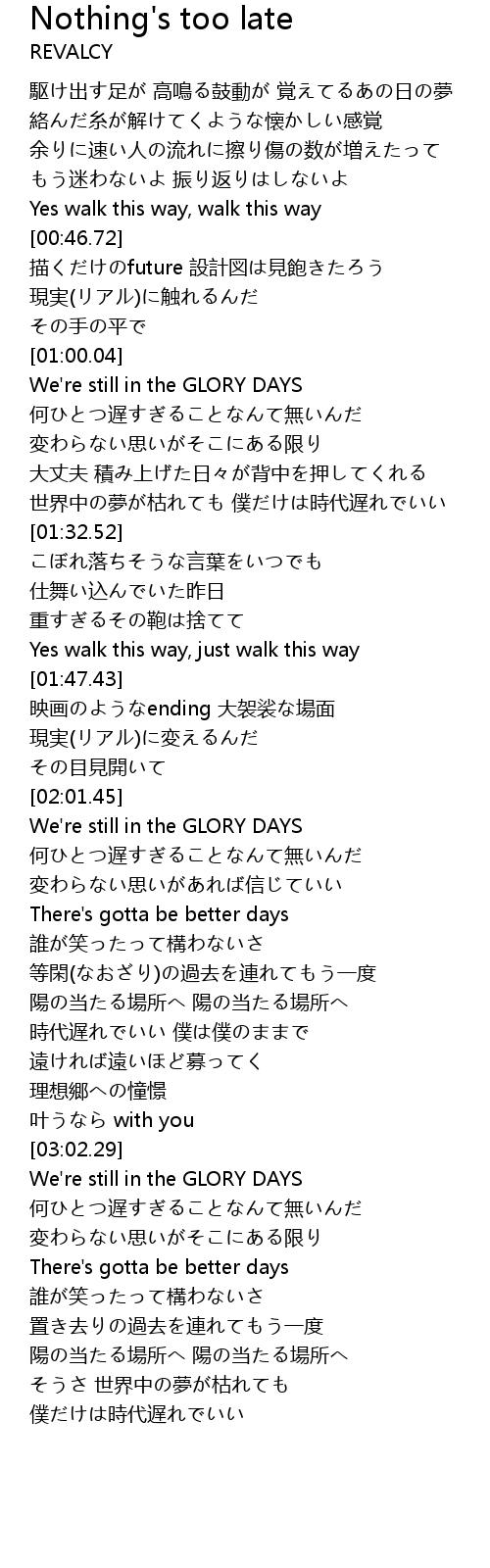 | [02:03.96] | 何ひとつ遅すぎることなんて無いんだ |