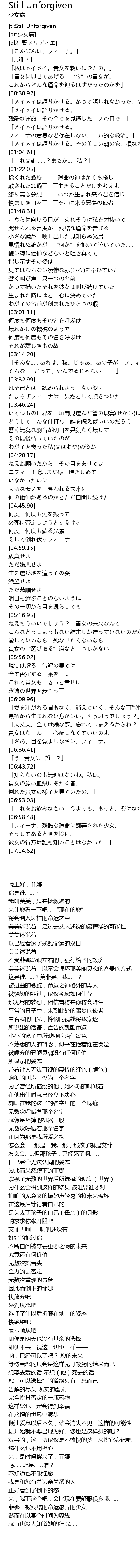 | [00:41.38] | 「メイメイは語りかける。かつて語られなかった、最も最悪の可能性。」 |