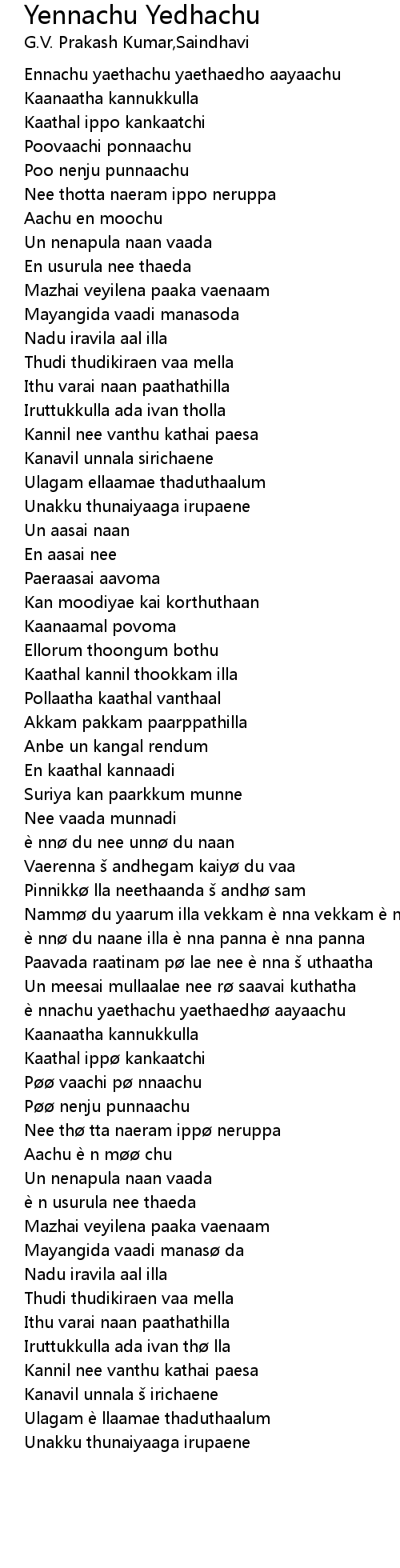 | [00:32.71] | Ennachu yaethachu yaethaedho aayaachu |
