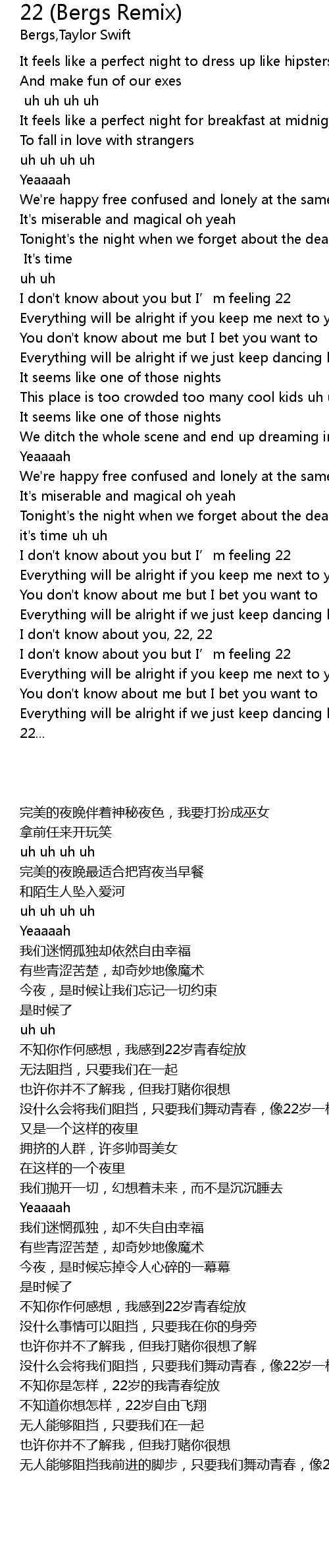 | [01:18.00] | Everything will be alright if we just keep dancing like we're 22, 22 |