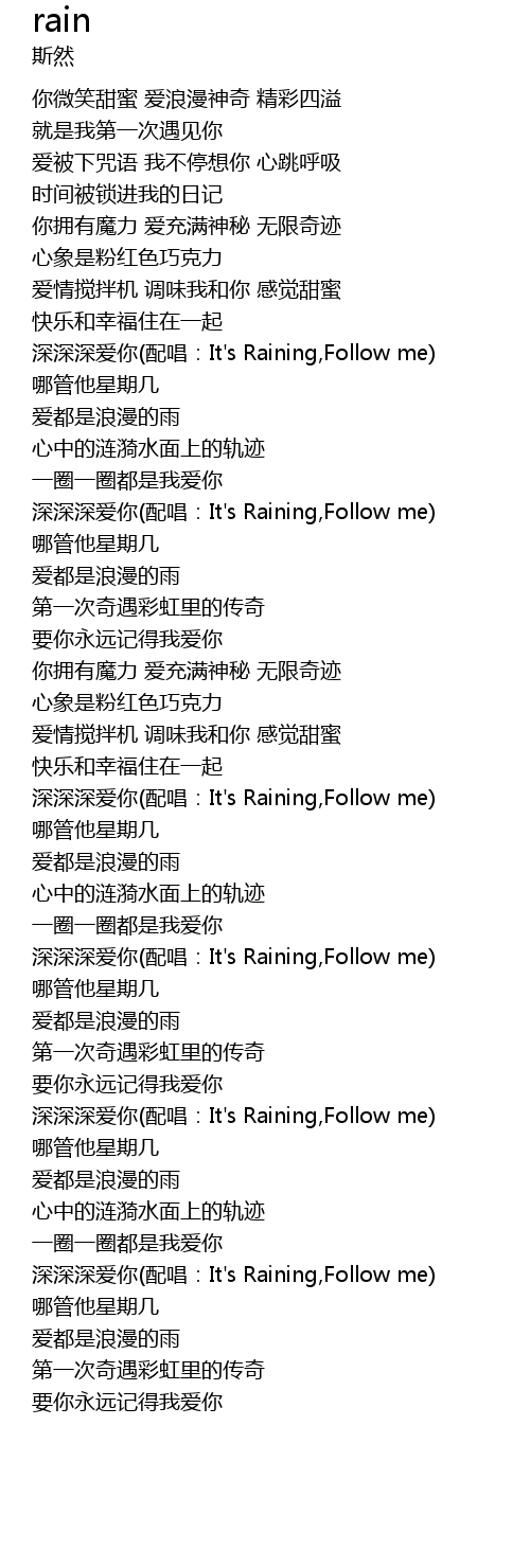 | shēn shēn shēn ài nǐ pèi chàng: It' s Raining, Follow me | |