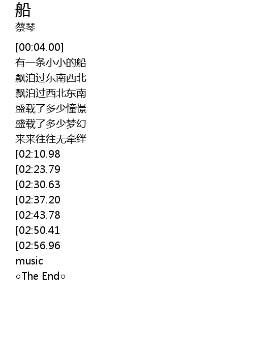 | [00:13.36] | yǒu yī tiáo xiǎo xiǎo de chuán |