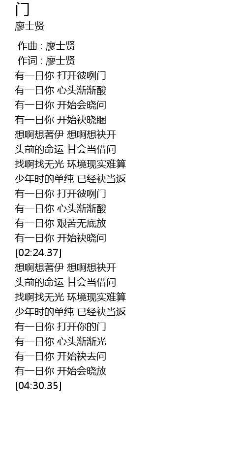 | [01:41.86] | 有一日你 打开彼咧门 |