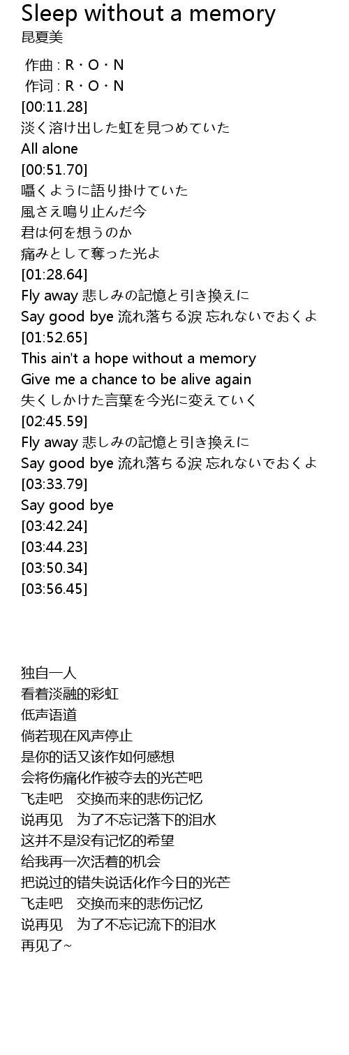 | [03:19.19] | Say good bye liú luò lèi wàng |