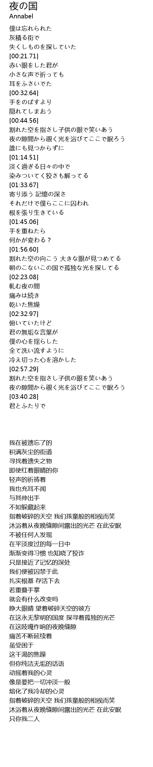 | [03:26.39] | 夜の隙間から覗く光を浴びてここで眠ろう |