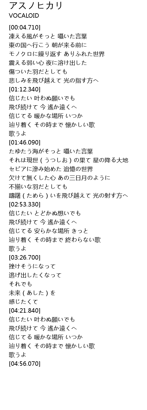 | [04:36.910] | 信じてる 暖かな場所 いつか |