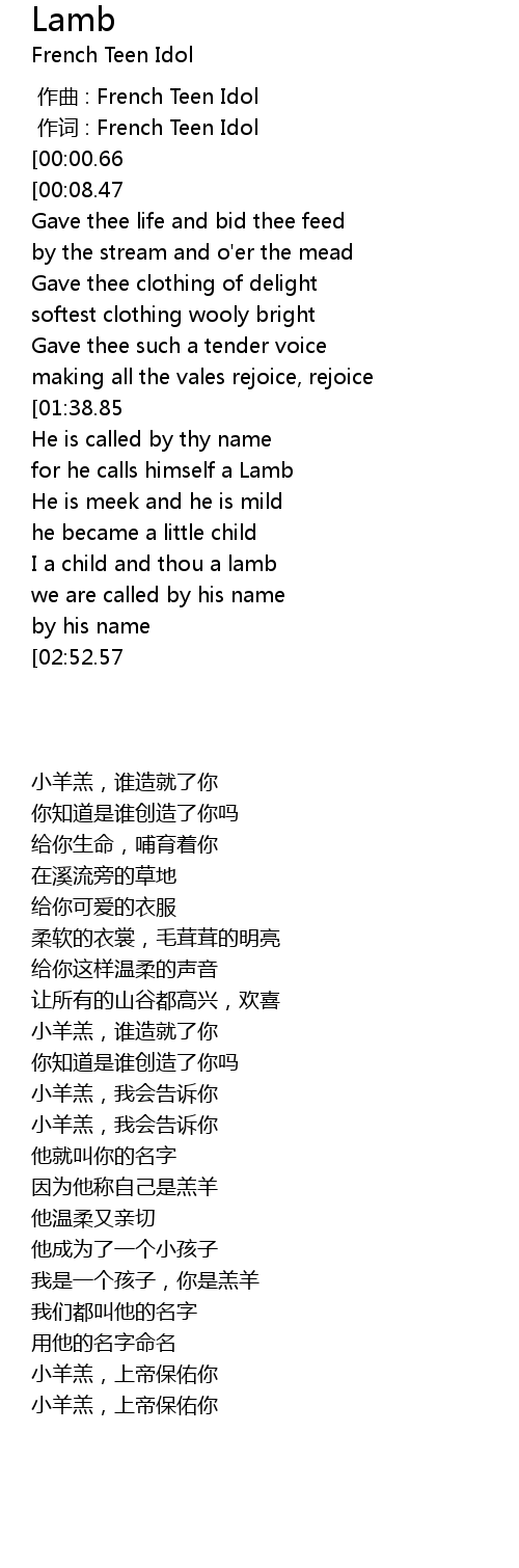 | [03:01.75][02:52.57] | Little Lamb God bless thee |