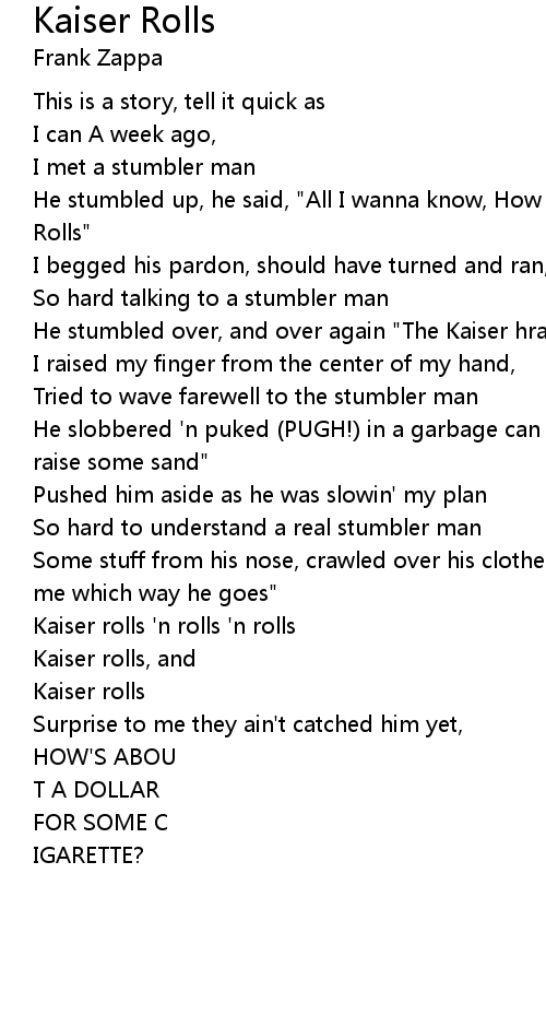 He stumbled up, he said, "All I wanna know, How far the hratche-plche Kaiser Rolls" |