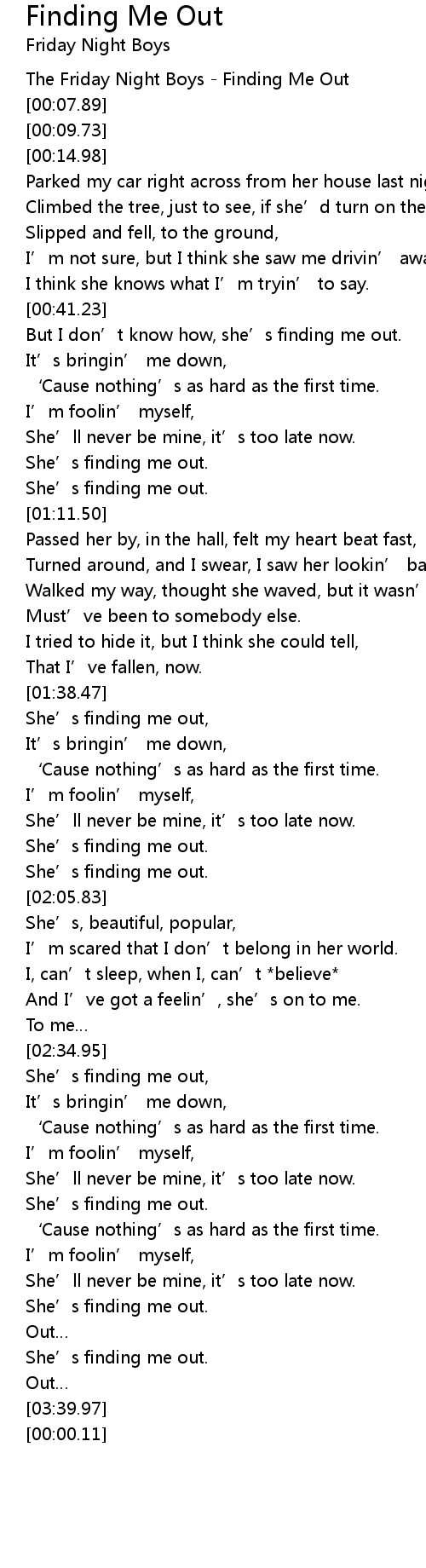| [00:01.12] | The Friday Night Boys Finding Me Out |