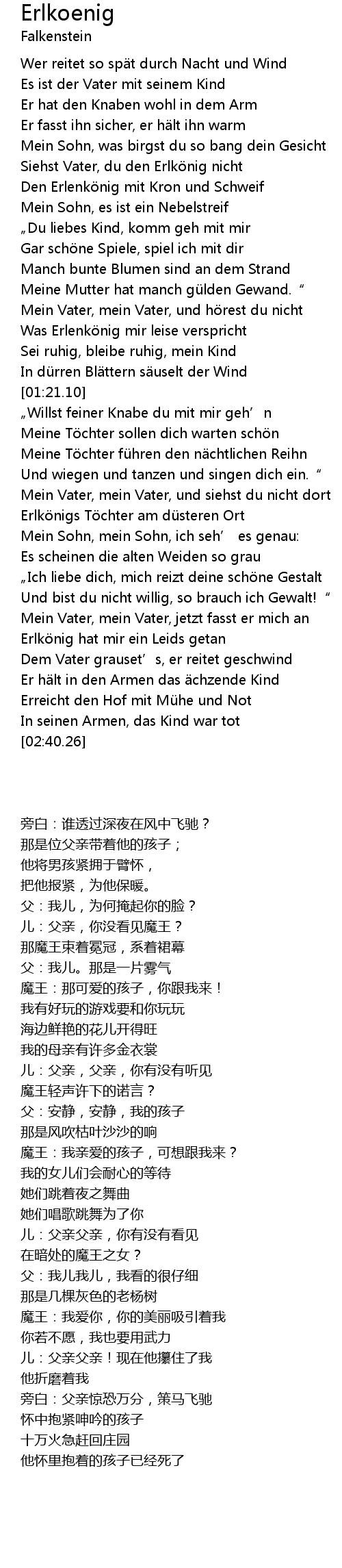 | [02:19.73] | Erlkönig hat mir ein Leids getan |