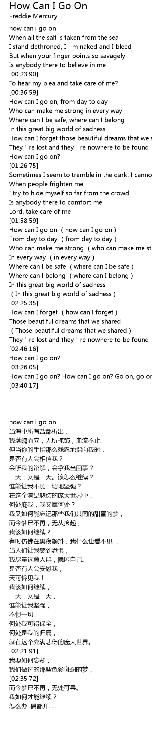 | [03:31.30] | How can I go on? How can I go on? Go on, go on, go on |