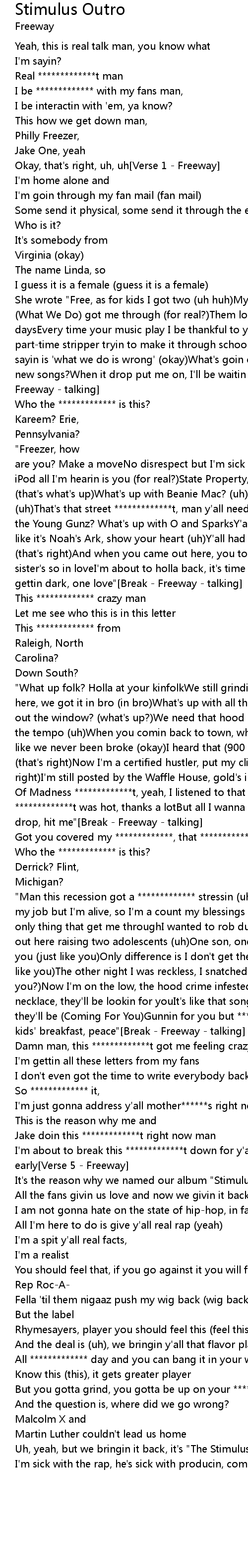 Huh?[Verse 4 - Freeway]"Man this recession got a ************* stressin (uh)Lost my job but I'm alive, so I'm a count my blessings (count 'em)Your music is the only thing that get me throughI wanted to rob dudes but I ain't got a weaponI'm out here raising two adolescents (uh)One son, one daughter, Free, I'm just like you (just like you)Only difference is I don't get them checks like you (checks like you)The other night I was reckless, I snatched a dude's necklace (did you?)Now I'm on the low, the hood crime infestedIf you take a ************* necklace, they'll be lookin for youIt's like that song with you and Beans, they'll be (Coming For You)Gunnin for you but ************* it, had to get my kids' breakfast, peace"[Break - Freeway - talking] |