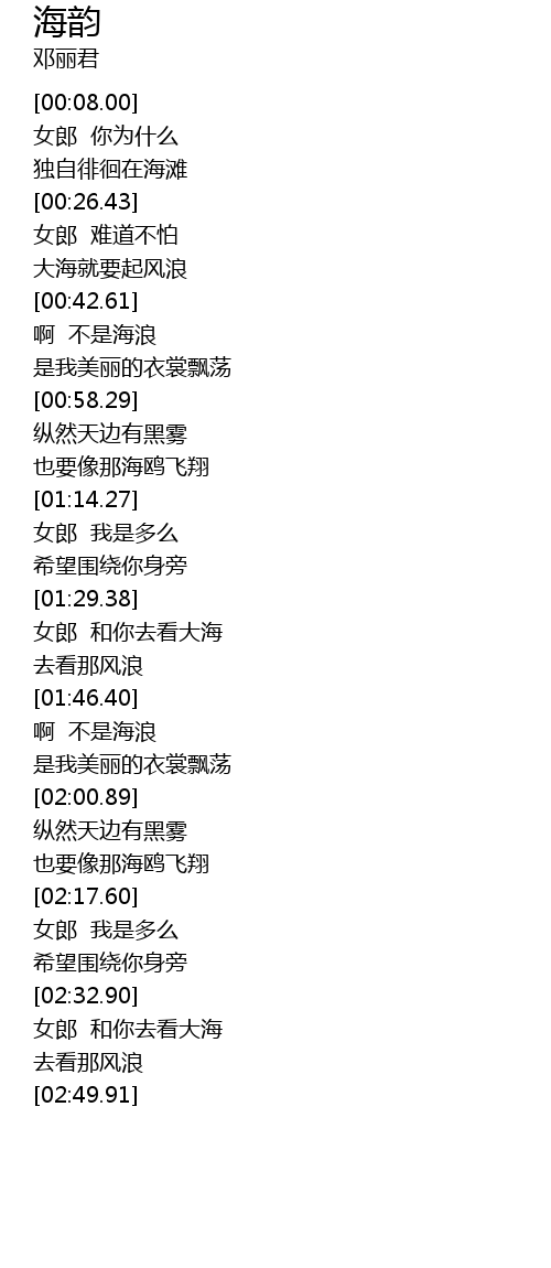 | [01:31.21] | nǚ láng hé nǐ qù kàn dà hǎi |