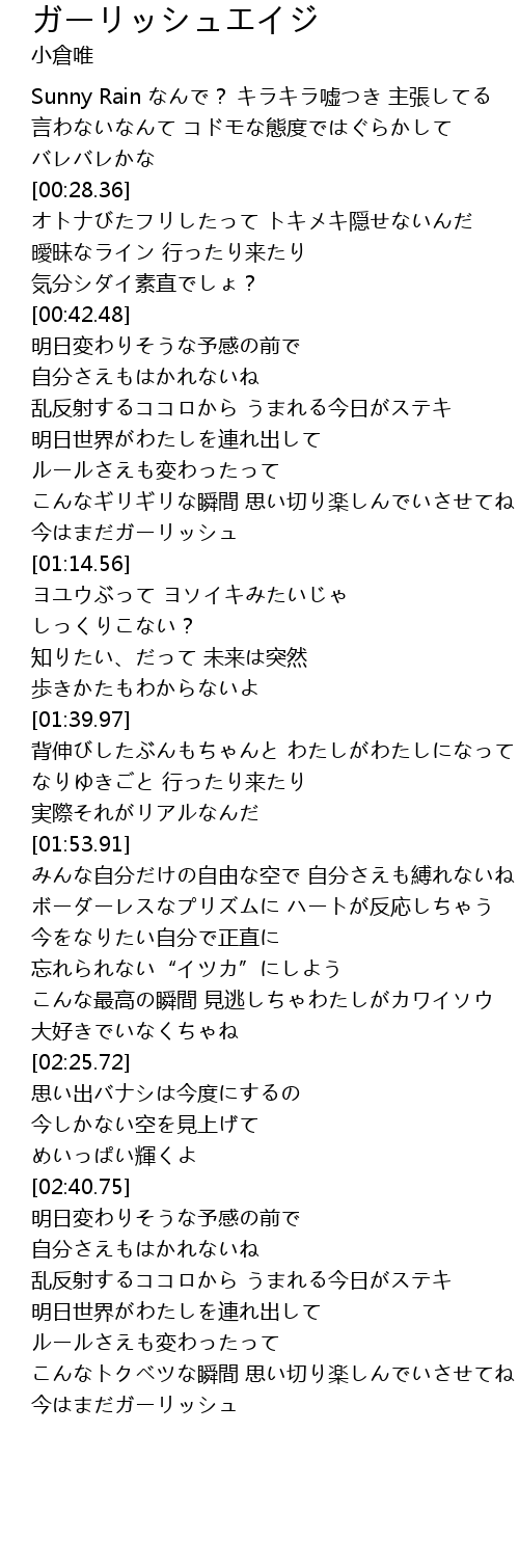| [00:16.62] | Sunny Rain なんで? キラキラ嘘つき 主張してる |
