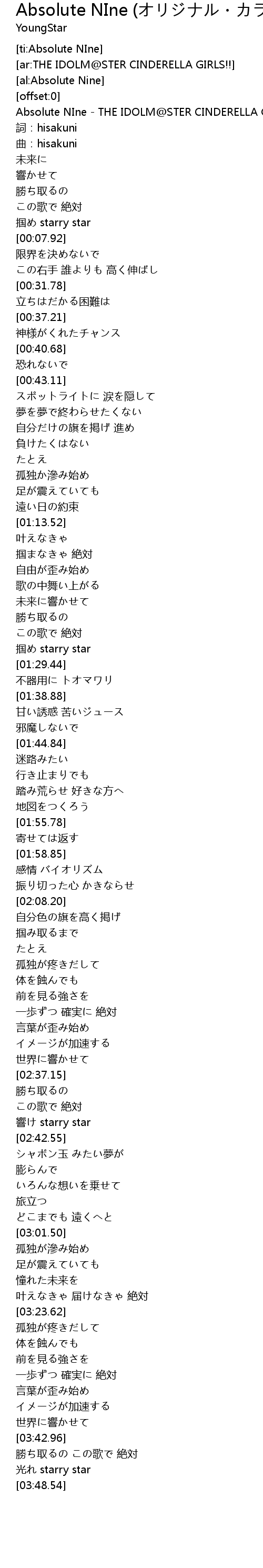 | [00:00.19] | Absolute NIne - THE IDOLM@STER CINDERELLA GIRLS!! |