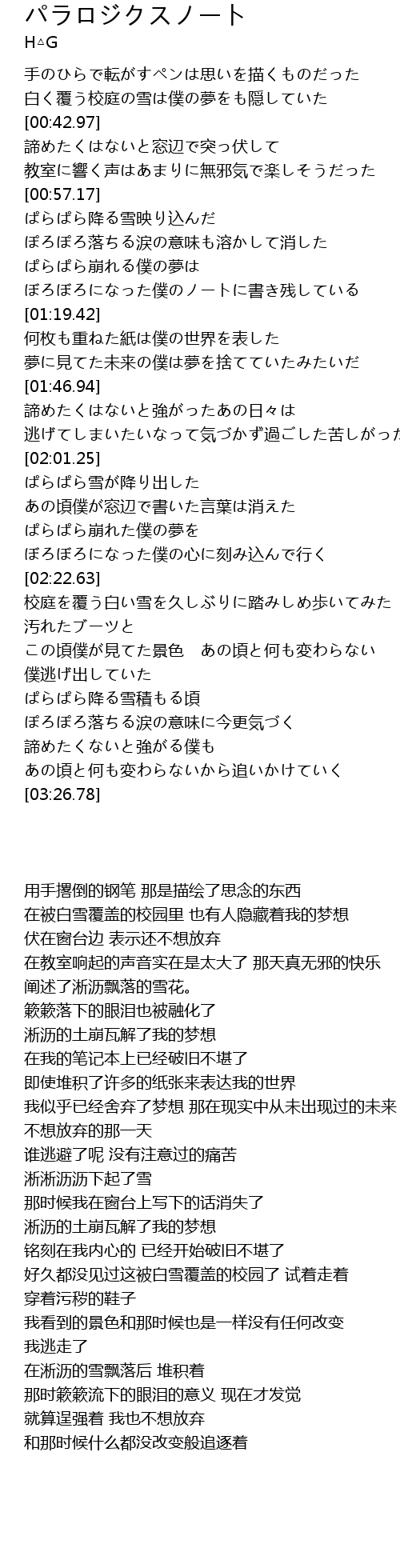 | [00:33.31] | 白く覆う校庭の雪は僕の夢をも隠していた |