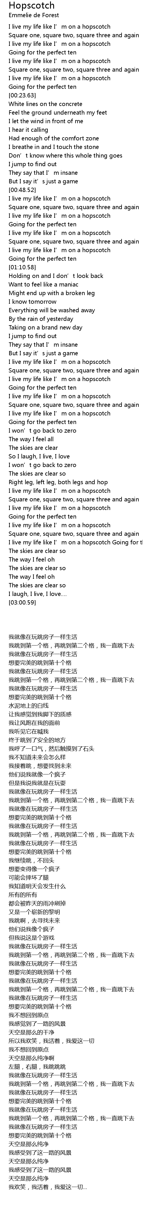 | [02:22.57] | I live my life like I' m on a hopscotch |