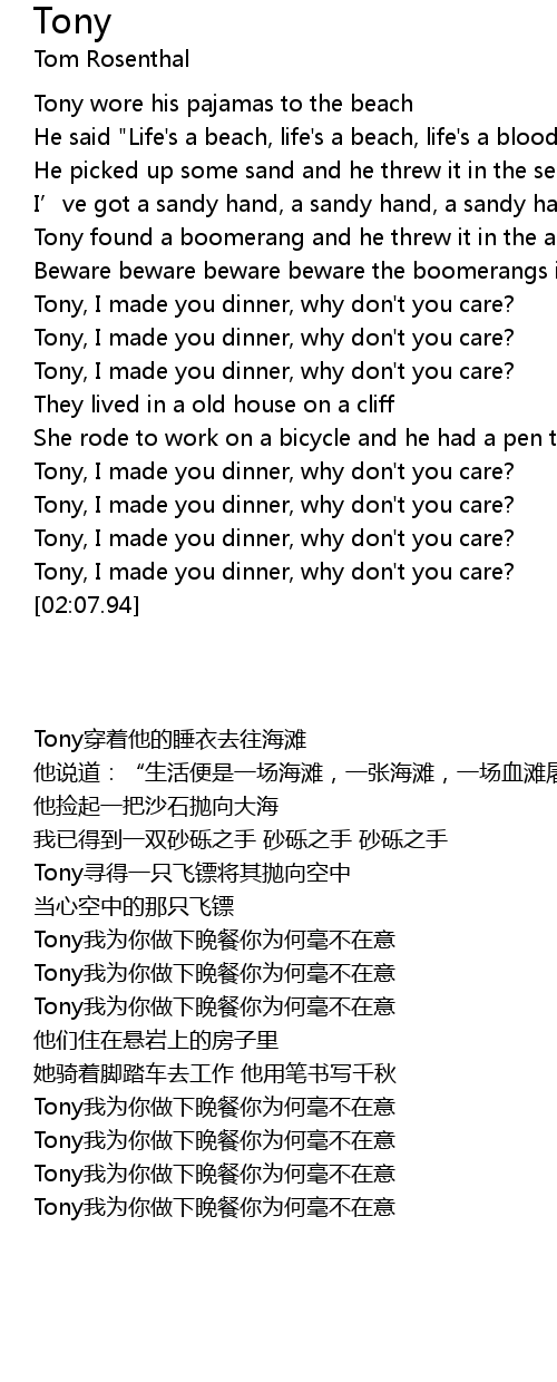| [00:09.59] | Tony wore his pajamas to the beach |