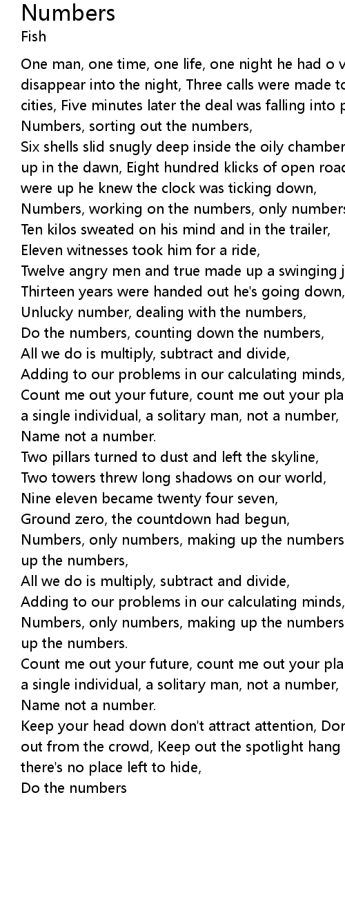 | One man, one time, one life, one night he had vision, Two lanes of blacktop disappear into the night, Three calls were made to different numbers in four cities, Five minutes later the deal was falling into place, | |