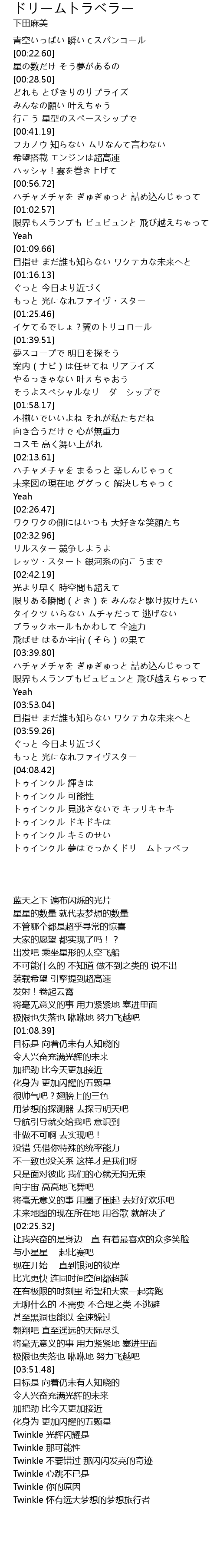 | [04:30.13] | Twinkle 怀有远大梦想的梦想旅行者 |