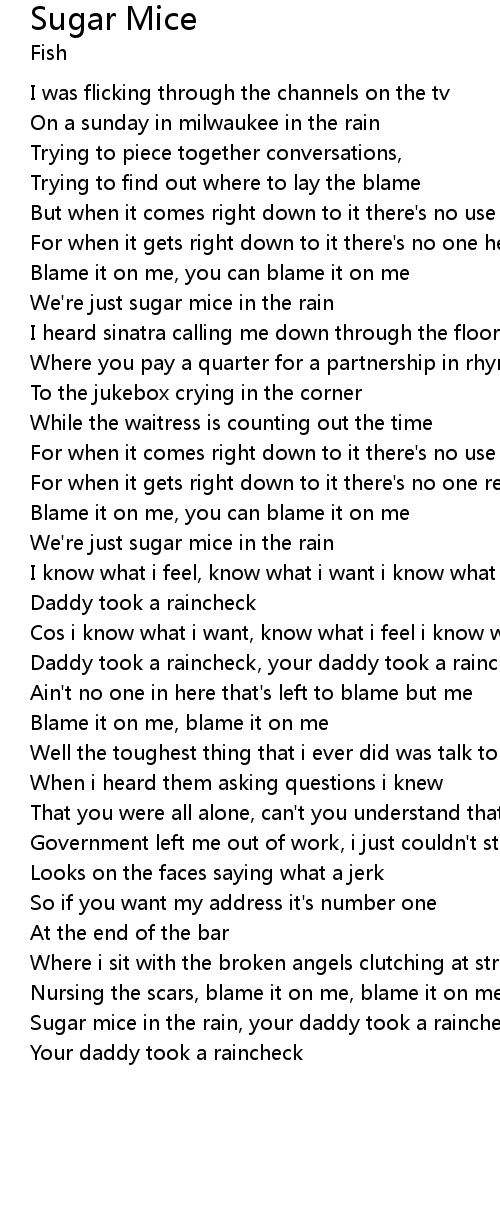 Sugar mice in the rain, your daddy took a raincheck |