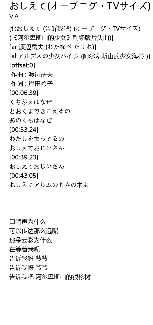 | [ti:おしえて (告诉我吧) (オープニグ・TVサイズ) (《阿尔卑斯山的少女》剧场版片头曲)] | |
