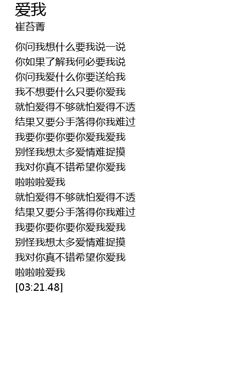 | [01:12.98] | wǒ yào nǐ yào nǐ yào nǐ ài wǒ ài wǒ |