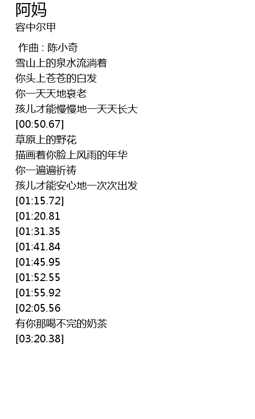 | [02:36.71][01:31.35] | 阿妈你为了我担过了多少怕 |