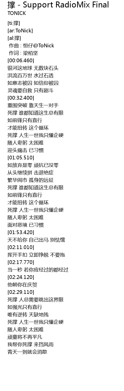 | [01:39.380] | 死撑 人生一世我只懂企硬 |